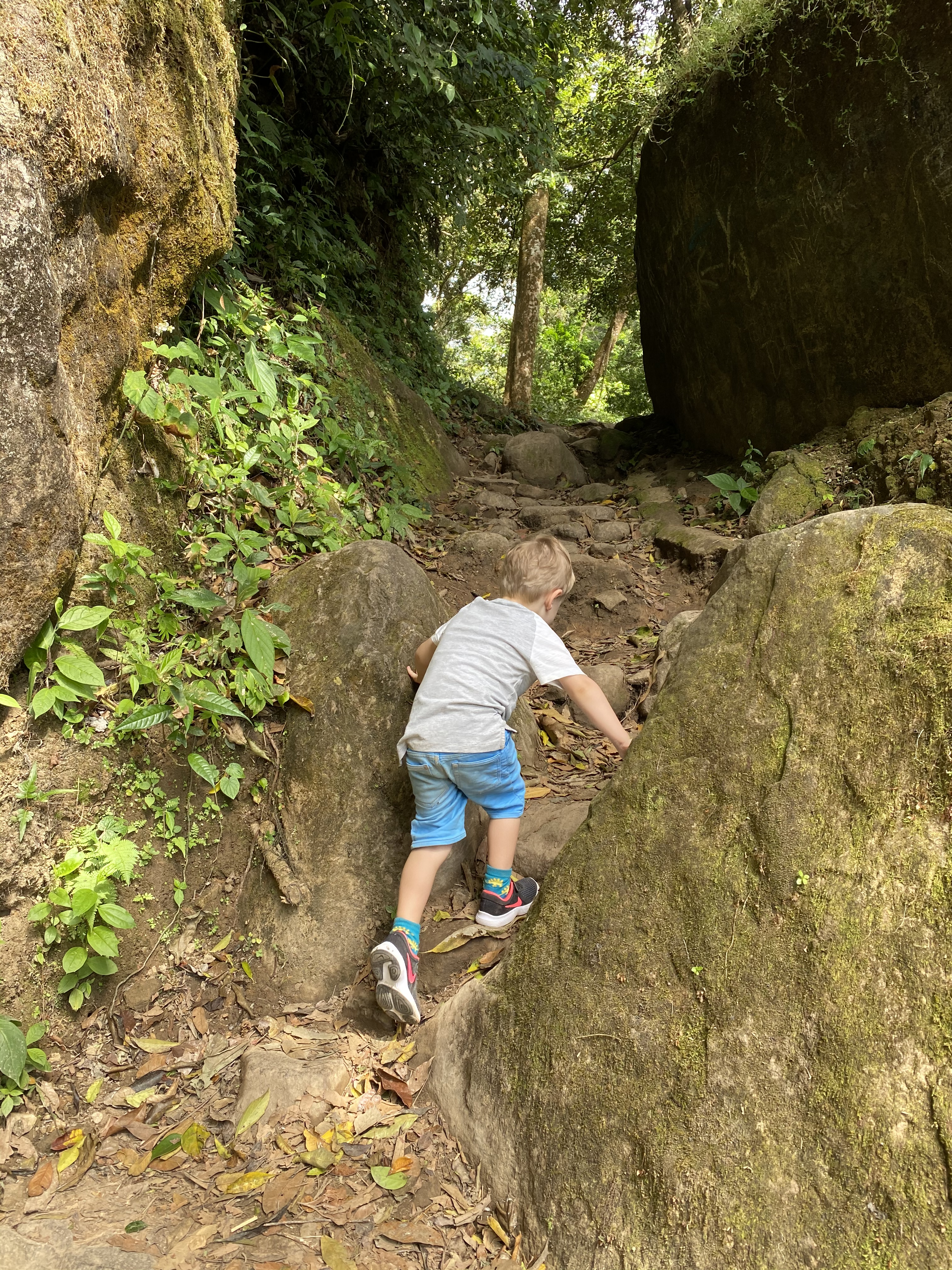We did a short walk to a waterfall yesterday, which went well, so we started eyeing up the main hike in town – La India Dormida. Squint slightly and the peaks look like a sleeping Indian, apparently. Google says 45 mins up, a 3 hour round trip??! Reviews suggested it was only for fit people, there was lots of scrambling, it was hard to find the path etc. But then we saw a blog from a woman who took her 6 year old up and therefore assumed everyone else was just being a bit dramatic.