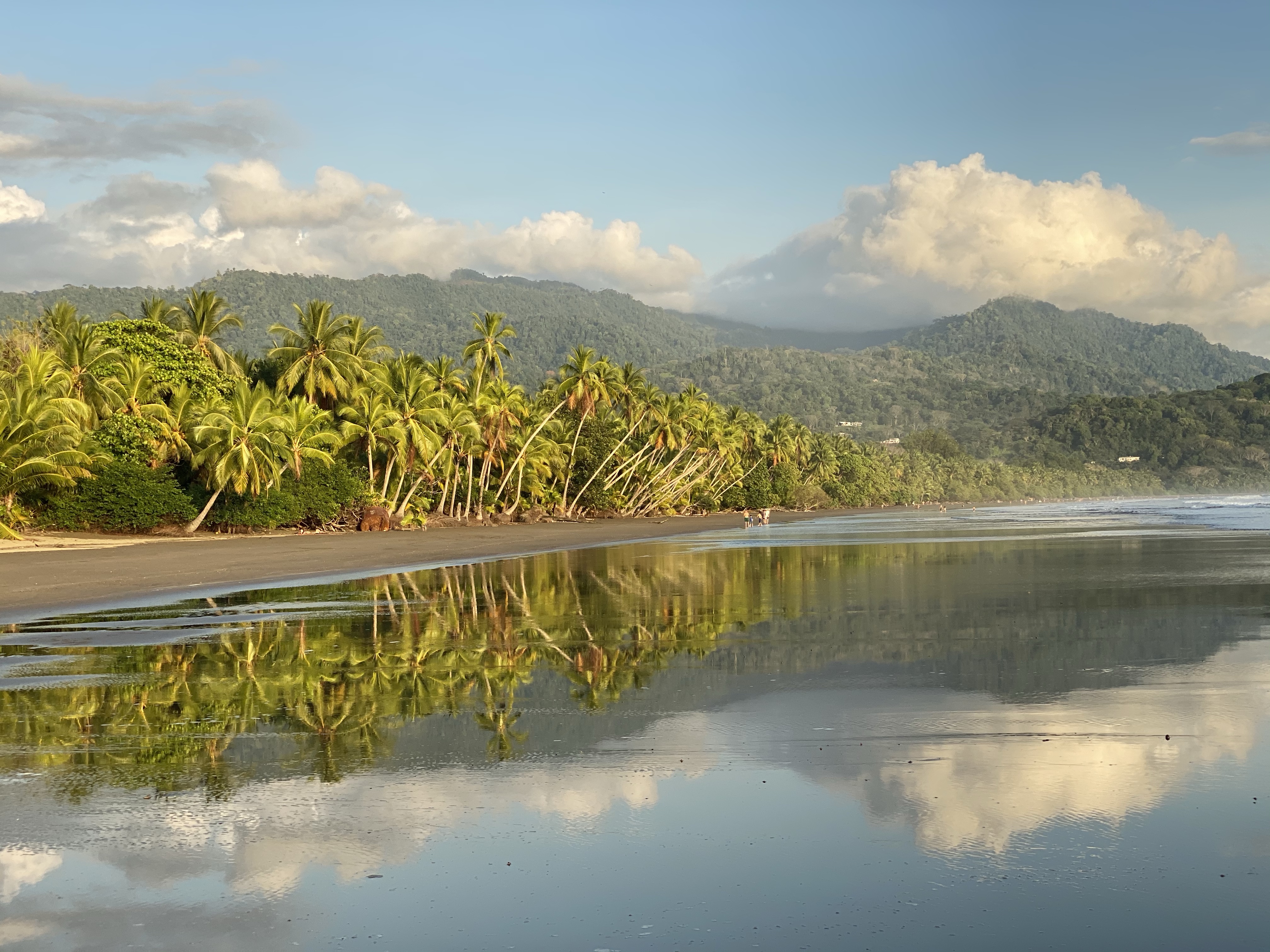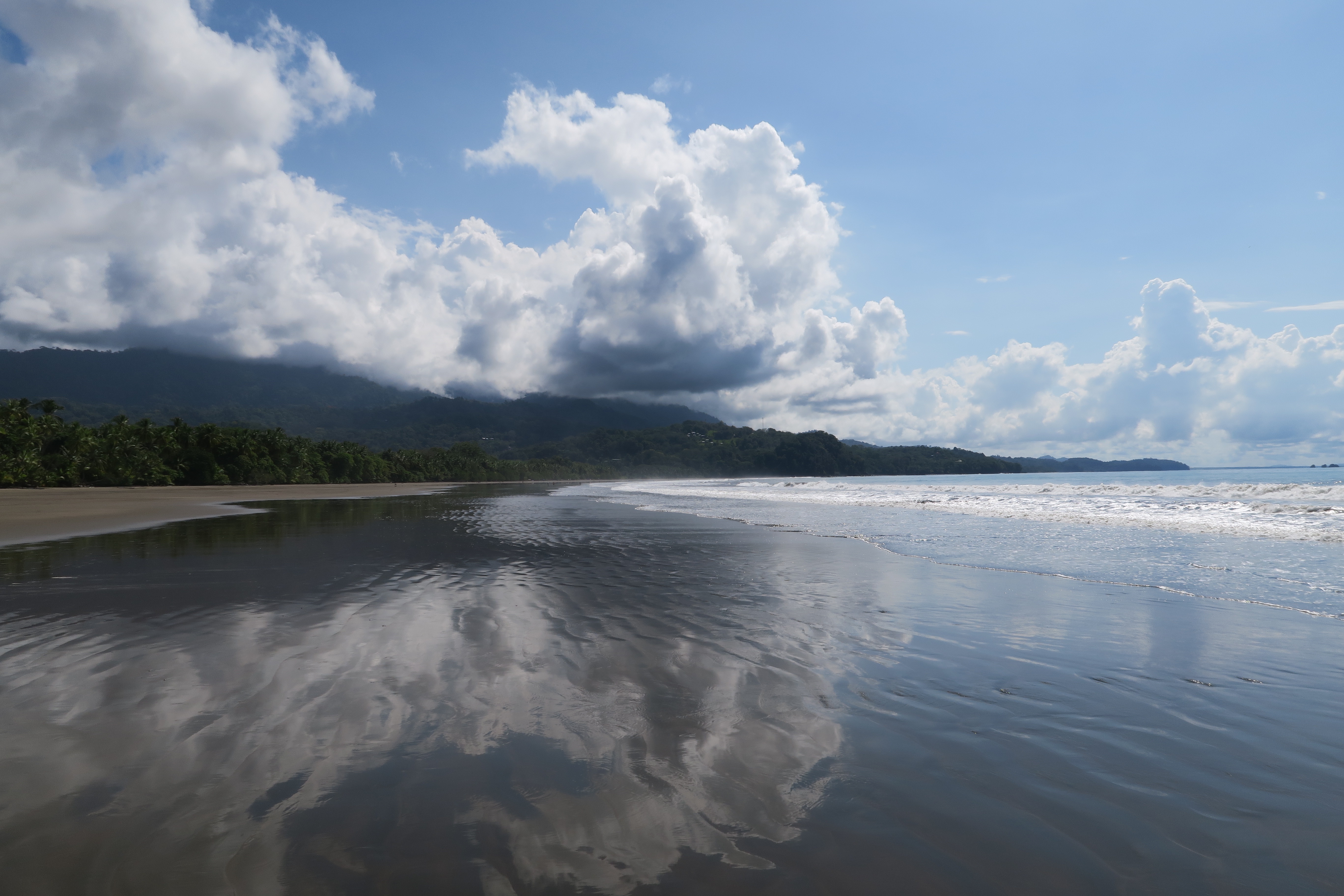The southern Pacific coast of Costa Rica is a bit more off the tourist map until you get to Manuel Antonio national park. It’s hot and humid with jungle mixed amongst the terrifying palm oil plantations that are typical around here. Palm oil is part of most processed foods amongst other things and a major cause of deforestation. It’s so sad to see what it is doing to countries like Costa Rica. Borneo was the worst example we ever saw with orangutans condemned to a thin strip of natural jungle only. The native jungle in this part of Costa Rica is thriving more so than Borneo and runs along the coast right down to the beaches which are long, gorgeous dark sandy strips that stretch on for miles and miles.