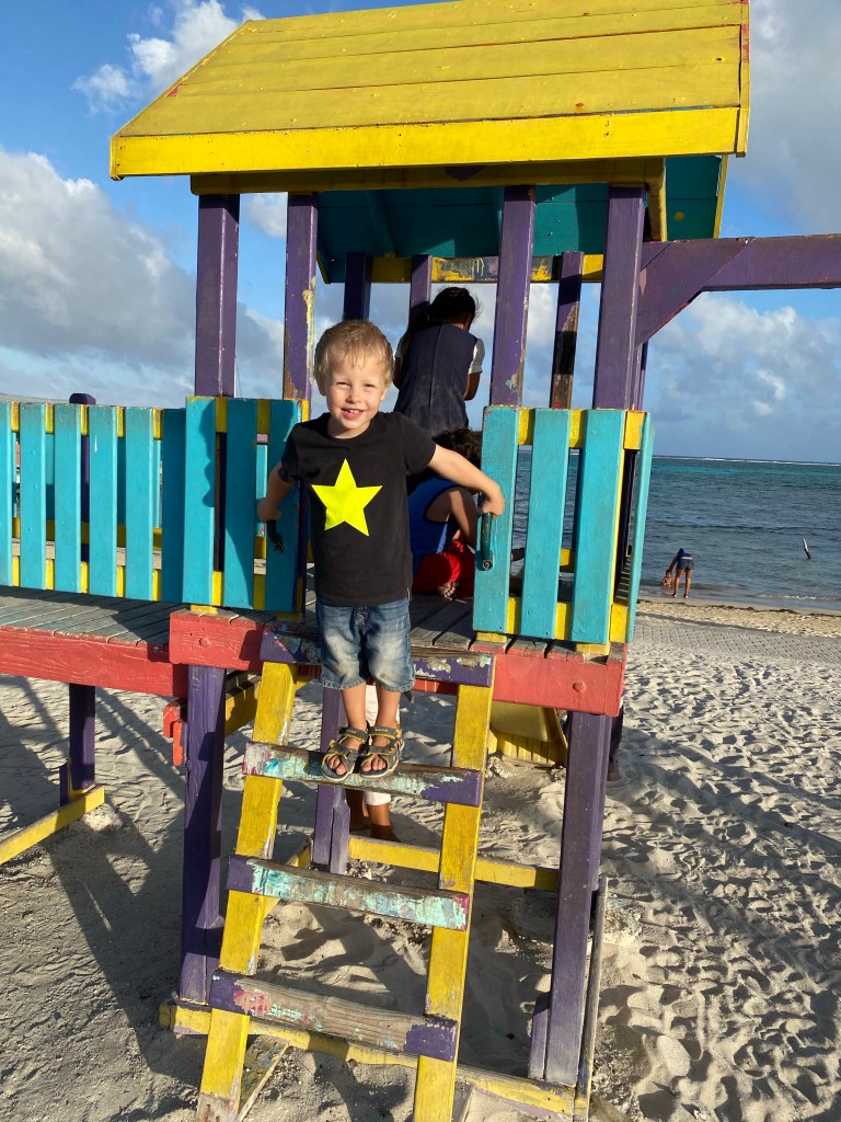 We’d hoped to be able to take a reef snorkelling trip whilst on the island but none of the operators would let James do the snorkelling so instead we spent our last day on the island chilling Caribbean style – checking out the local playgrounds, eating ice cream, afternoon beers, diving off jetties into the sea… at which James excelled and impressed everyone with his daredevil antics.